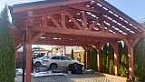 Навес для автомобилей Аларес — это функциональное и сбалансированное решение для защиты двух транспортных средств на компактной территории. Габариты 6,6×5,1 м и площадь 34 м² позволяют разместить автомобили с удобными проходами и достаточным пространством для открывания дверей, не занимая лишнюю землю на участке. Коньковая крыша с двумя скатами обеспечивает эффективный водоотвод и предотвращает скопление снега, что особенно важно в условиях частых осадков. Каркас выполнен из высококачественной хвойной древесины, прошедшей камерную сушку, что исключает деформации и гарантирует долговечность строения. Отсутствие хозблока делает всю полезную площадь доступной для парковки, а грамотная конструкция позволяет органично вписать навес в любой ландшафт. Кровельное покрытие из битумной черепицы "Shinglas" обеспечивает надежную защиту от осадков и придает навесу законченный вид.