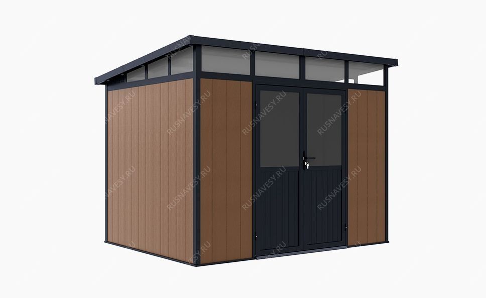 Сарай Defender выполнен из ДПК и алюминия 9х7 футов с односкатной крышей. Он идеально подходит для хранения садового инвентаря, инструментов и прочего оборудования. Современный и лаконичный дизайн идеально впишется в вашем саду или на даче. Сарай Defender обладают стойкостью к влаге и ультрафиолетовым лучам, требуют минимального ухода и сохраняют свой привлекательный вид на протяжении долгого времени. Состав: 60% древесные опилки 30% Полимер 10% Добавки Характеристики: Крыша выполнена из металла с напылением. Окна из полимерного стекла, толщиной 2.5 мм. Прозрачные в козырьке крыши, полупрозрачные в дверях. Площадь крыши, м²: 6.84 м² Угол наклона крыши: 6° Карниз крыши - передний: 65 мм Карниз крыши - сзади: 55 мм Карниз крыши - боковые стороны: 105 мм Алюминиевое основание (В х Т): 30 х 20 мм Пол: нет В комплекте: 3 ключа Преимущества: Материалы: Изготовлен из ДПК и алюминия, что обеспечивает прочность и долговечность. Функциональность: Идеален для хранения садового инвентаря, инструментов и оборудования. Дизайн: Современный и лаконичный внешний вид, гармонично вписывается в ландшафт. Устойчивость: Стойкость к влаге и ультрафиолетовым лучам. Уход: Минимальные требования к обслуживанию. Долговечность: Сохраняет привлекательный вид на протяжении долгого времени. Упаковка: Изделие поставляется в двух упаковках: паллет + коробка